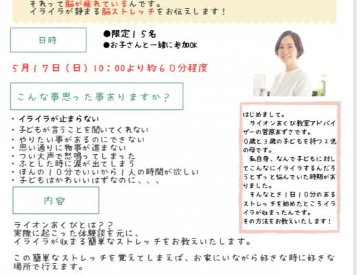 2020年5月17日(日)10時〜(60分程度) ライオンあくび教室 無料説明会を開催いたします!! 子育て中の全てのママに今必要なメソッドです! 家庭保育、外出自粛でみんなストレスが溜まっています。 少しでもそのストレスを軽減させたい、そう思ってお伝えしたいメソッドです。 ・子どもが言うことを聞いてくれない ・やりたい事があるのにできない ・思い通りに物事が進まない ・つい大声で怒ってしまった […]…